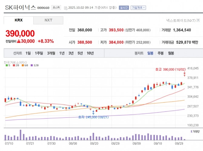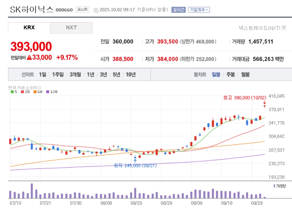 [속보] SK하이닉스 9% 올라 39만원대 돌파... 삼성전자도 4% 급등