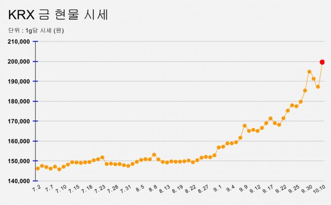 이미지 확대보기10일 오전 9시 11분 한국거래소(KRX) 금시장에 따르면 금 현물은 전 거래일 종가(187,300원)보다 12,350원(+6.59%) 오른 1g당 199,650원에 거래되고 있다. 장중 시가는 202,120원, 고가는 202,150원으로, 지난달 기록한 사상 최고가(203,000원)에 바짝 근접한 수준이다.