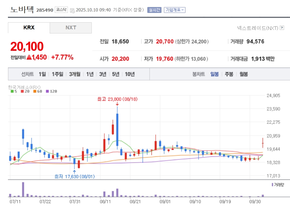 10일 한국거래소에 따르면 이날 오전 09시40분 노바텍은 7.77% 급등한 2만100원을 기록하고 있다. 유니온머티리얼은 상한가를 이어가고 있으며 유니온 16.78%, 동국알앤에스 9.15%, 성안머티리얼스 7.50% 등이 급등 중이다.