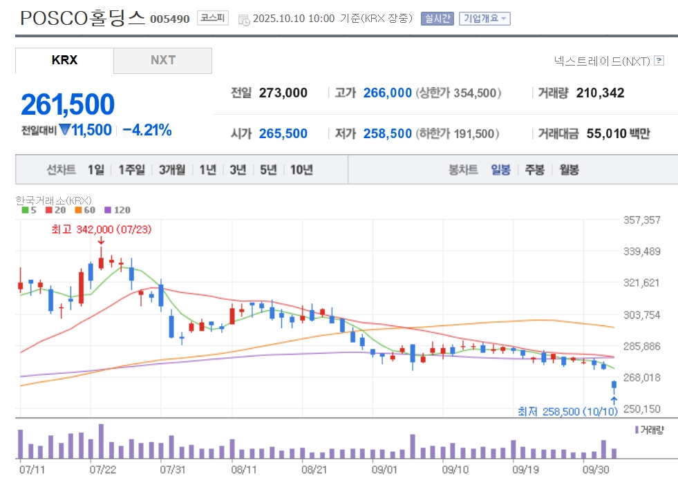 10일 한국거래소에 따르면, 오전 10시분 현재 국내 최대 철강회사인 포스코그룹 지주회사 POSCO홀딩스는 유가증권시장에서 전거래일에 비해 4.21% 빠진 26만1500원에 거래되고 있다. 세아그룹 지주회사 세아베스틸지주는 전 거래일보다 6.68% 하락한 2만3750원에 거래되고 있고, 세아제강과 동국제강 주가는 각각 3.86%, 3.61% 하락하고 있다.