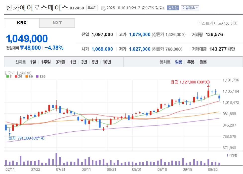 10일 한국거래소에 따르면 이날 오전 10시 24분 현재 한화에어로스페이스는 전 거래일 대비 4.38% 내린 104만9000원에 거래되고 있다. LIG넥스원(-6.04%)·풍산(-4.98%)·한화시스템(-4.18%)·현대로템(-3.10%) 등도 내리고 있다. 한화에어로스페이스는 K9 자주포와 '천무' 다연장로켓 등을, LIG넥스원은 천궁 지대공 미사일과 해성 대함미사일, 풍산은 155mm 대구경 포탄 등 각종 탄약을, 한화시스템은 지휘통제시스템 등을 생산한다. 현대로템은 폴란드에 수출된 주력 전차 'K2'흑표 전차를 생산한다.