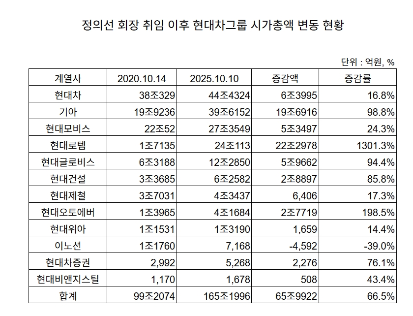 현대차그룹의 시가총액 상승을 주도한 것은 회사의 주축인 현대차와 기아의 약진이다. 현대차는 2020년 초 38조 원에서 현재 44조 원대로 증가했고, 기아는 19조 원에서 39조 원대로 약 2배 증가했다. 두 회사의 합산 시가총액이 83조 원을 넘어서면서 그룹 성장을 주도하고 있다. 여기에 현대모비스(27조 원), 현대로템(24조 원대), 현대글로비스(6조 원대) 등 계열사 가치 상승이 더해지며 그룹 전체 규모는 5년 만에 1.7배로 확대됐다.
