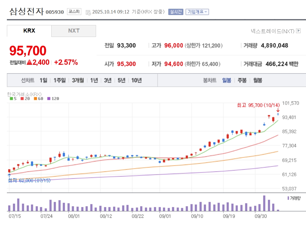 14일 한국거래소에 따르면 이날 오전 9시 12분 현재 삼성전자는 전 거래일 대비 2.57% 오른 9만 5700원에 거래되고 있다. 이 가격은 52주 신고가다.