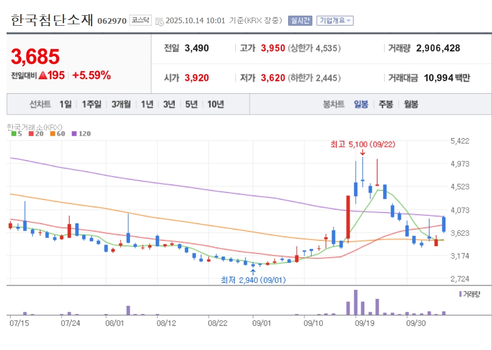 14일 한국거래소에 따르면 오전 10시 01분 기준 한국첨단소재는 코스닥시장에서 전 거래일 대비 5.59% 오른 3685원에 거래되고 있다. 양자컴퓨터 관련주로 묶이는 케이씨에스(7.5%), 엑스게이트(6.89%), 우리로(2.61%) 등도 오르고 있다.