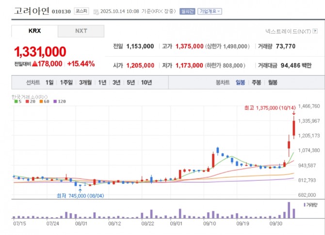 14일 한국거래소에 따르면 오전 10시08분 코스피시장에서 고려아연은 전 거래일 대비 15.44% 오른 133만1000원에 거래 중이다. 전날 19.48% 급등에 이어 또다시 강세를 보였다. 지난 10일부터 3거래일 연속 오름세다.