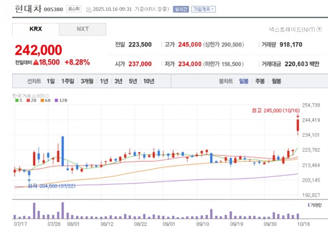 이미지 확대보기16일 한국거래소에 따르면 오전 9시 31분 기준 현대차는 유가증권시장에서 전 거래일 대비 8.28% 오른 24만2000원에 거래되고 있다. 기아 역시 전날 대비 7.32% 뛴 11만1400원을 기록하고 있다.