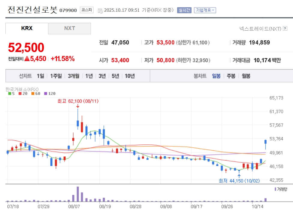 17일 한국거래소에 따르면 오전 9시 51분 현재 전진건설로봇은 전장 대비 11.58% 오른 5만2500원에 거래되고 있다. 개장 직후에는 5만3500원까지 오르기도 했다. SG(8.20%), 에스와이스틸텍(5.33%), 대동(2.48%), 다산네트웍스(1.77%) 등 다른 우크라이나 재건 테마주도 줄줄이 상승 중이다.