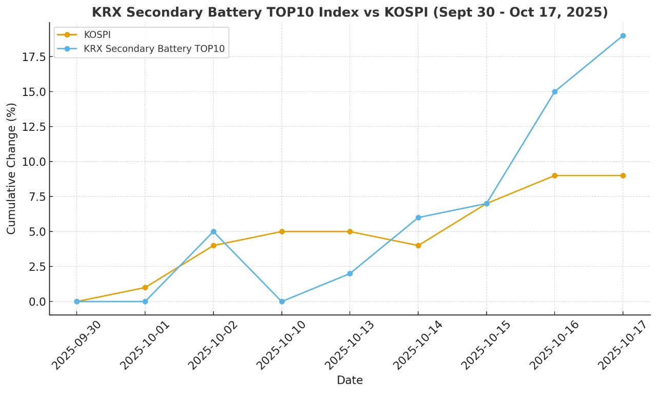 시가총액 변화는 더욱 뚜렷하다. 'KRX 2차전지 TOP10 지수' 구성 10개 종목 합산 시가총액은 9월 말 194조2000억 원에서 10월 17일 241조2000억 원으로 늘어 약 47조 원 증가했다. 증가율은 24.2%를 기록 중이다.