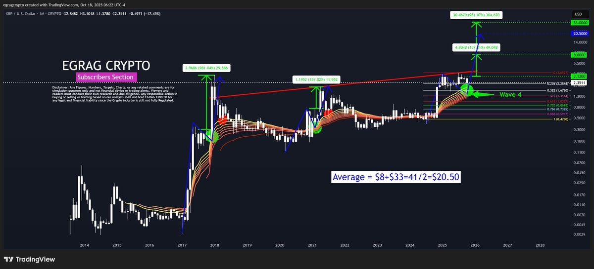 에그래그는 최근 게시물을 통해 XRP가 엘리엇 파동 주기의 4파동을 거의 완료한 것으로 보인다고 강조했다. 4파동은 흔히 트레이더들이 최종 급등으로 알려진 5파동 직전에 조기 매도를 유발하는 조정 단계다. 그의 계산에 따르면, 4파동은 약 1.40달러 근처에서 마무리되어 향후 상승 랠리를 위한 발판을 마련했을 가능성이 크다.