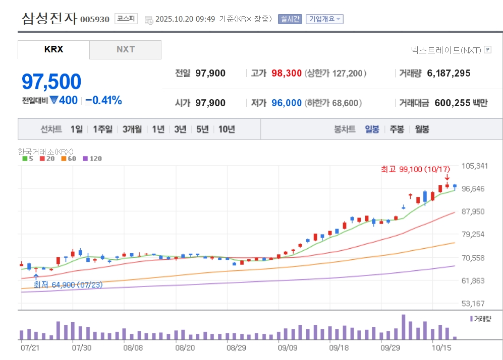 이미지 확대보기20일 한국거래소에 따르면 이날 오전 오전 9시 49분 현재 삼성전자는 전 거래일보다 0.41% 내린 9만7500원에 거래되고 있다.
