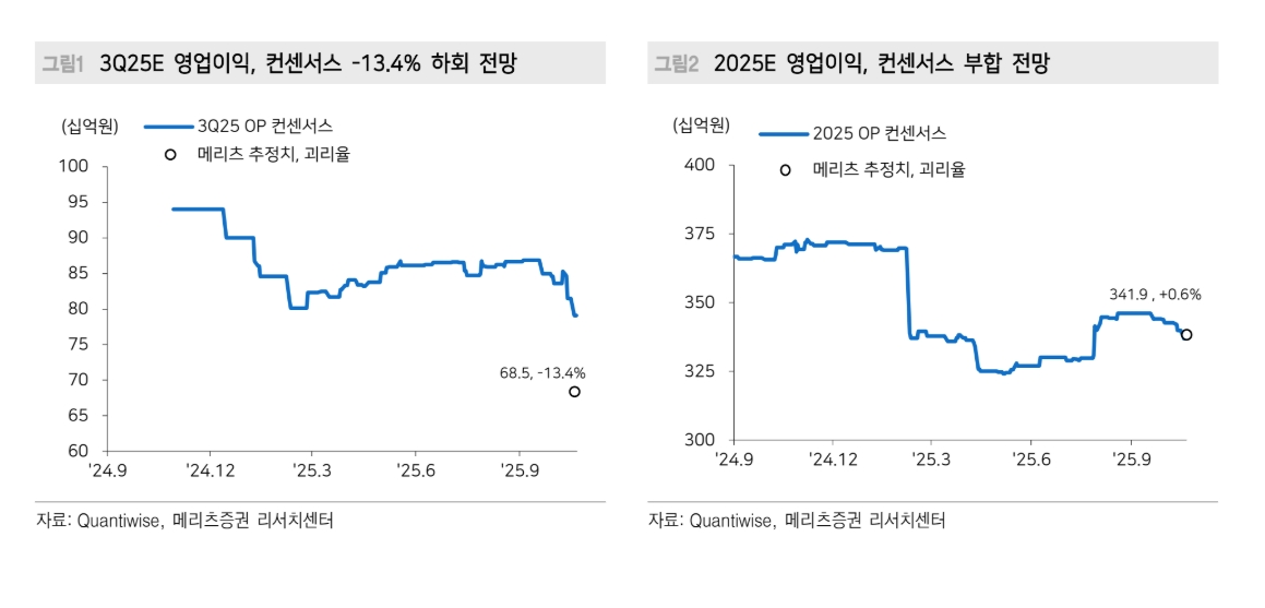 이미지 확대보기이지호 메리츠증권 연구원은 “동사는 3Q25(3분기) 매출액 8372억원, 영업이익 685억원을 기록하면서 컨센서스를 하회하는 실적을 기록할 전망”이라며 “국내사업 중 회전익 인도가 지연된 점이 주요 원인으로 작용하며 폴란드향 FA-50 사업 또한 일부 지연이 있었다"고 파악했다.