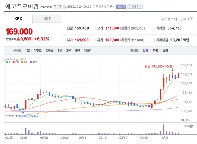 이미지 확대보기24일 한국거래소에 따르면 이날 오전 9시 35분 기준 에코프로비엠 주가는 전날 종가에 비해 6.02% 오른 16만9000원에 거래되고 있다.계열사로 양극재를 생산하는 에코프로도 2.94% 오르고 있다.
