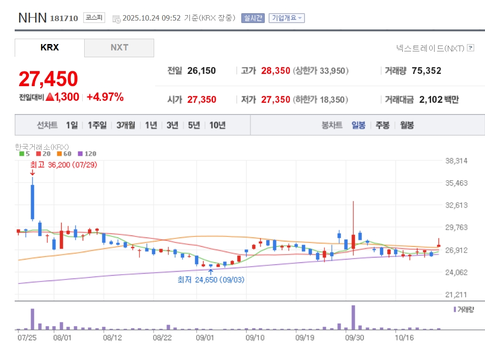 이미지 확대보기24일 한국거래소에 따르면 NHN은 이날 오전 9시 52분 기준으로 전 거래일 대비 4.97% 오른 2만 7450원에 거래되고 있다.