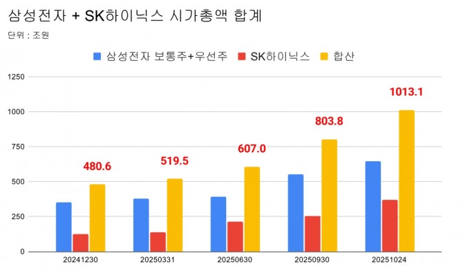 이에 따라 삼성전자(보통주+우선주) 시가총액은 약 644조원, SK하이닉스는 369조원으로, 합계 1013조원에 달했다.
