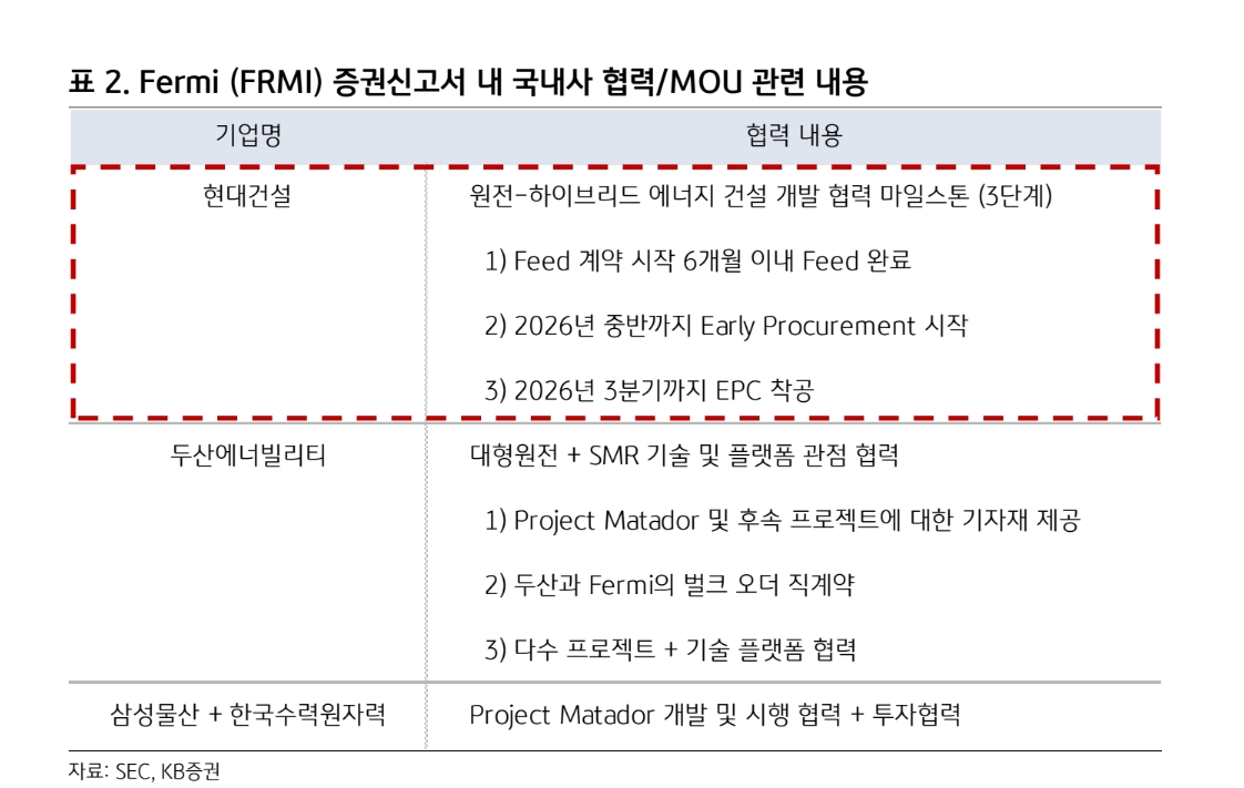 또 “홀텍과의 소형모듈원전(SMR) 착공, 내년 중 웨스틴하우스와 함께 불가리아 원전 착공, 페르미 원전의 기본설계 계약 완료 후 EPC(설계·조달·시공) 전환이 내년 말까지의 기대 파이프라인”이라고 덧붙였다.