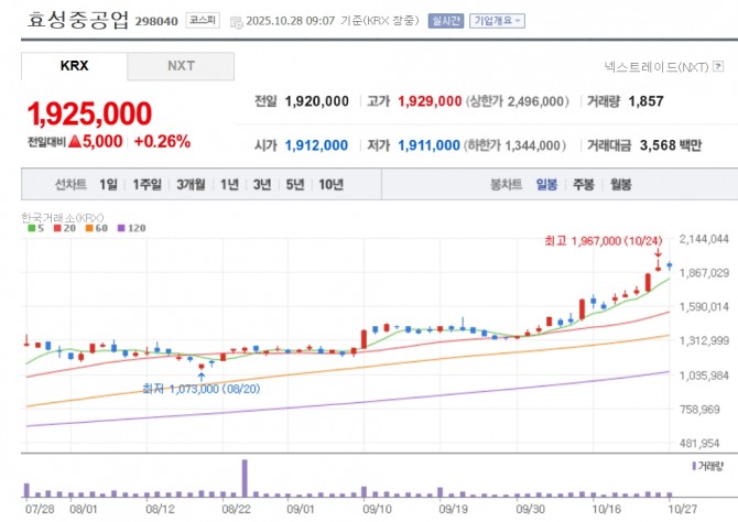이미지 확대보기28일 한국거래소에 따르면 효성중공업의 주가는 오전 9시07분 전일대비 0.26% 오른 192만5000원을 기록하고 있다. 지난 24일에는 196만7000원을 터치하며 52주 신고가를 갈아치웠다. 지난해 107만3000원을 기록한 이후 지속적으로 상승세를 보이며 200만원을 코앞에 두고 있는 것이다.