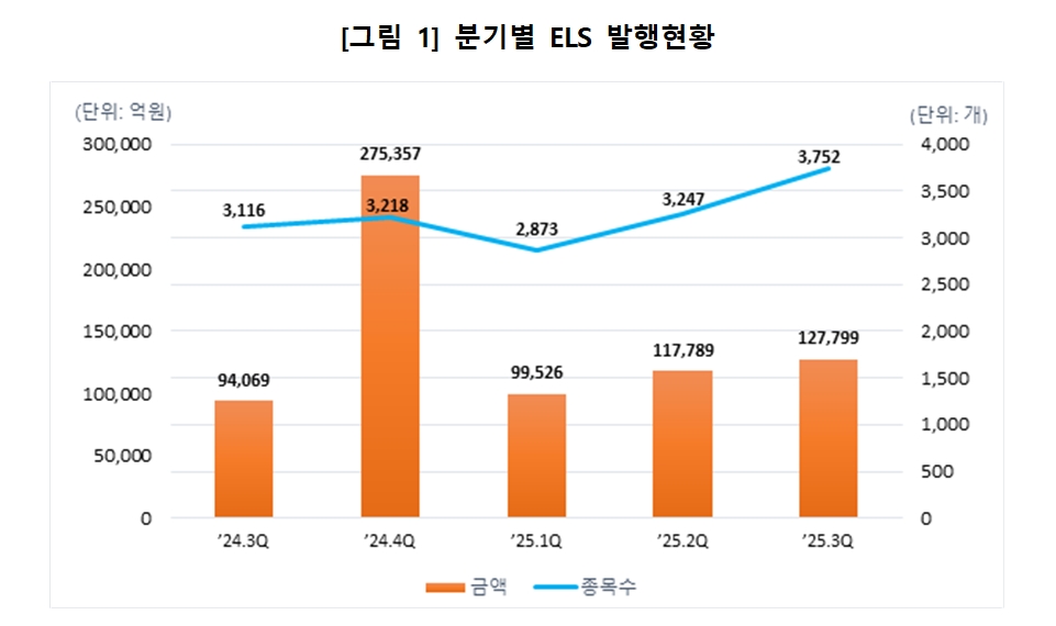 이미지 확대보기28일 한국예탁결제원에 따르면, 올해 3분기 ELS 발행액은 12조7799억원으로, 전년 동기 대비 35.9% 증가했다. 발행 종목 수는 3752개로 20.4% 늘었다.