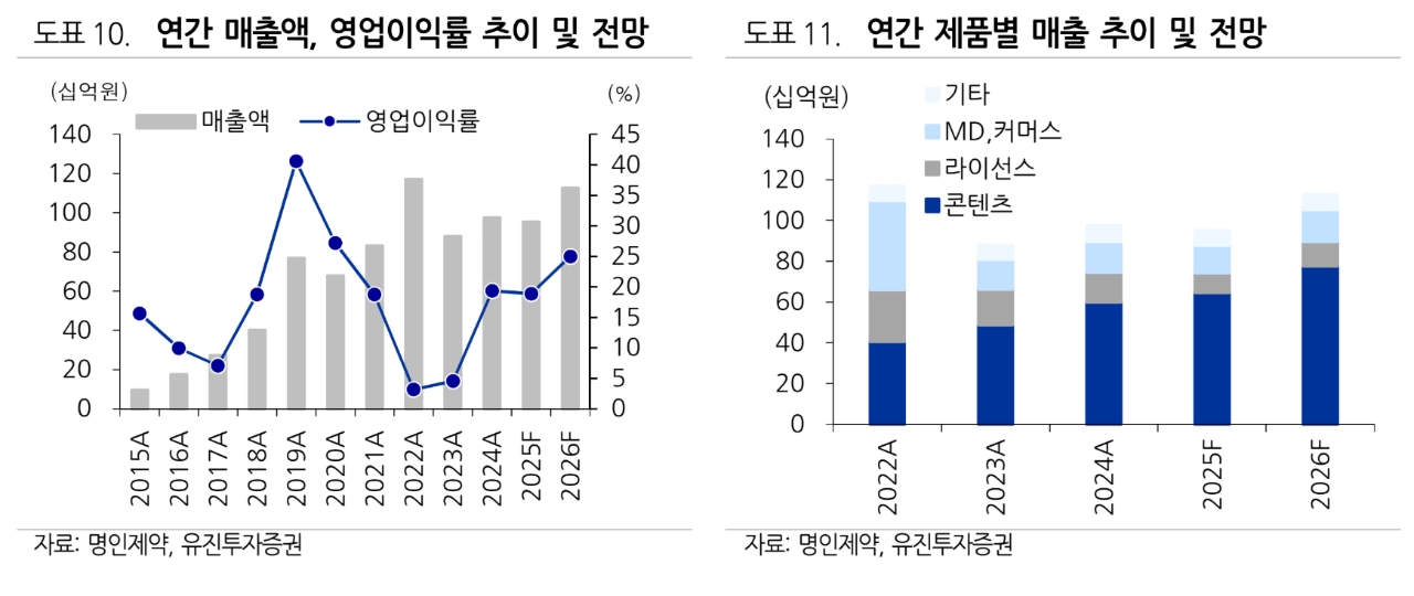 이미지 확대보기더핑크퐁컴퍼니는 ‘핑크퐁’·‘아기상어’·‘베베핀’ 등 글로벌 흥행 IP를 다수 보유한 패밀리 엔터테인먼트 기업이다. 2024년 기준 매출 콘텐츠 61.5%, 라이선스 15.2%, MD·커머스 15.3%로 구성돼 있다. 영업이익률은 2023년 4.5%에서 2024년 19.3%, 2025년 상반기 22.1%로 급등했다.
