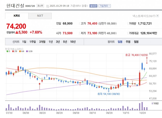 이미지 확대보기29일 한국거래소에 따르면 이날 오전 9시18분 현재 현대건설은 전거래일 대비 7.69% 오른 7만 4200원에 거래 중이다. 이외에도 우리기술(8.52%), 두산에너빌리티(7.06%), 오르비텍((6.34%), 한전기술(5.88%) 등 원전 관련주 등이 일제히 강세다.