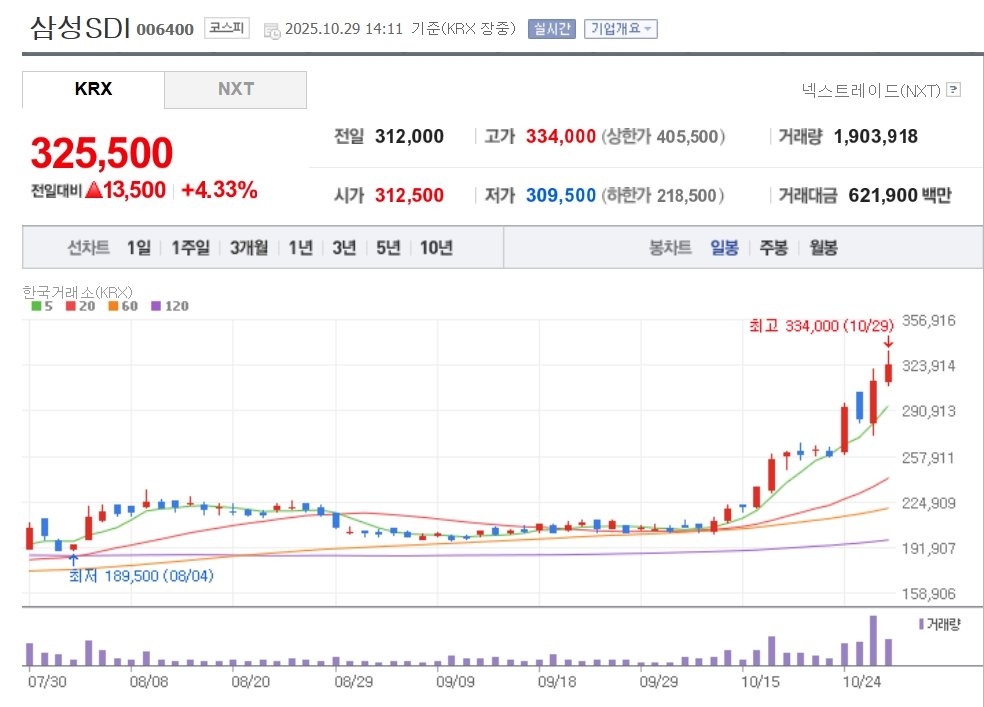 이미지 확대보기29일 한국거래소에 따르면. 오후 2시11분 현재 유가증권시장에서 삼성SDI는 전날에 비해 4.33% 오른 32만 5500원에 거래되고 있다. 장 중 33만 4000원까지 올랐다.