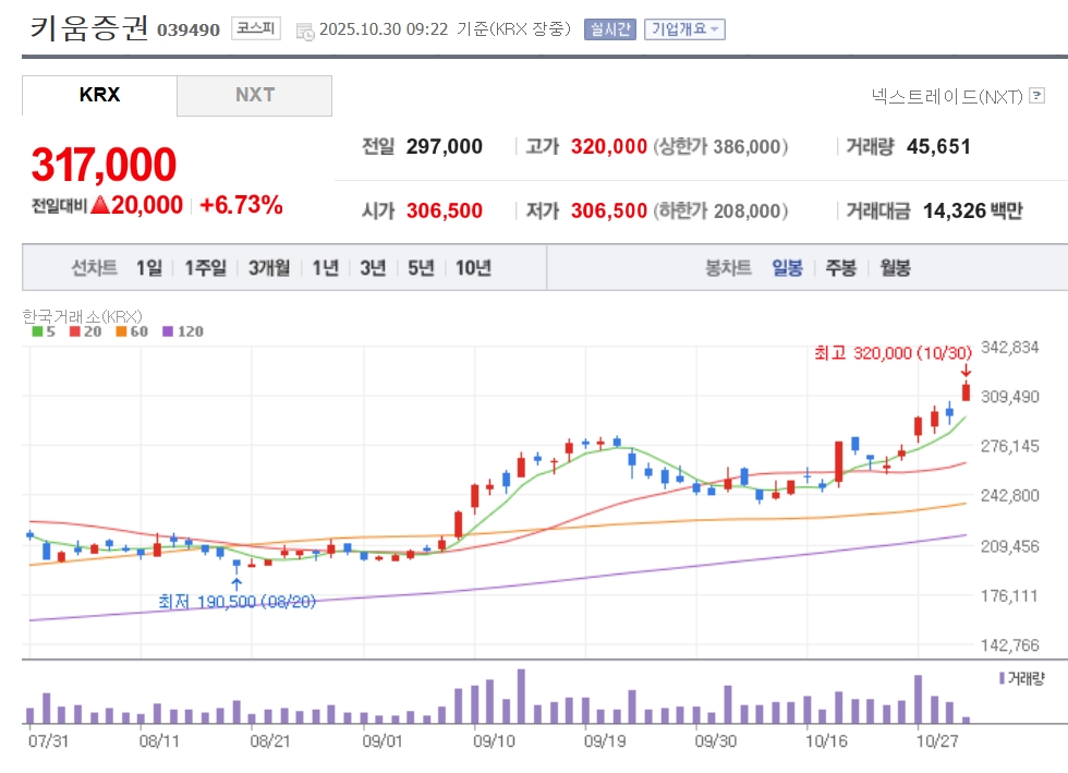 이미지 확대보기30일 한국거래소에 따르면 이날 오전 9시22분 현재 키움증권은 전거래일 대비 6.73% 오른 31만 7000원에 거래 중이다. 장중 32만원까지 오르면서 52주 신고가를 경신했다.