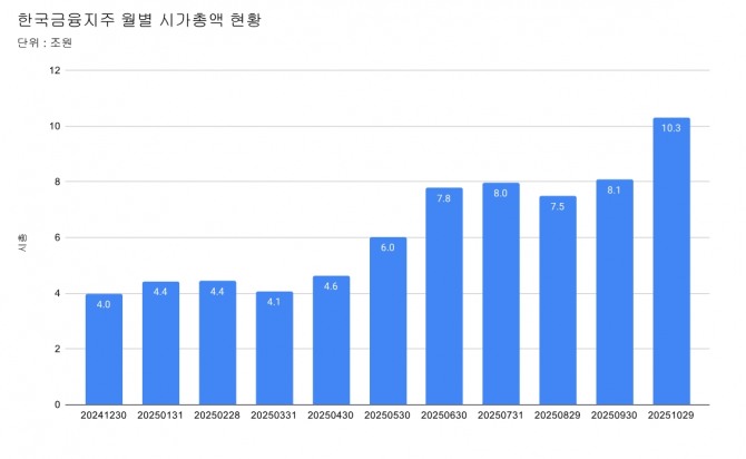 올해 들어 한국금융지주의 몸집은 5월 6조원을 넘어선 데 이어, 6월에는 7조7,000억원, 9월에는 8조원을 돌파하며 가파른 상승세를 이어왔다.