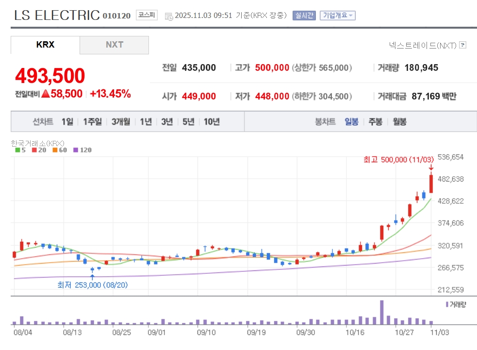 이미지 확대보기3일 한국거래소에 따르면 이날 오전 9시 51분 기준 전력설비 빅3 기업 중 LS ELECTRIC은 전 거래일 대비 13.45% 증가한 49만 3500원에 거래되고 있다. 효성중공업도 8.10% 오른 30만 8000원에 거래 중이다.