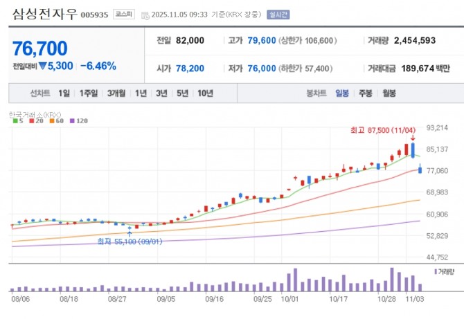 이미지 확대보기5일 한국거래소에 따르면 오전 9시 33분 현재 삼성전자는 전 거래일 대비 6.46% 하락한 7만 6700원에 거래되고 있다. SK하이닉스는 4.44% 떨어진 56만원에 거래 중이다.