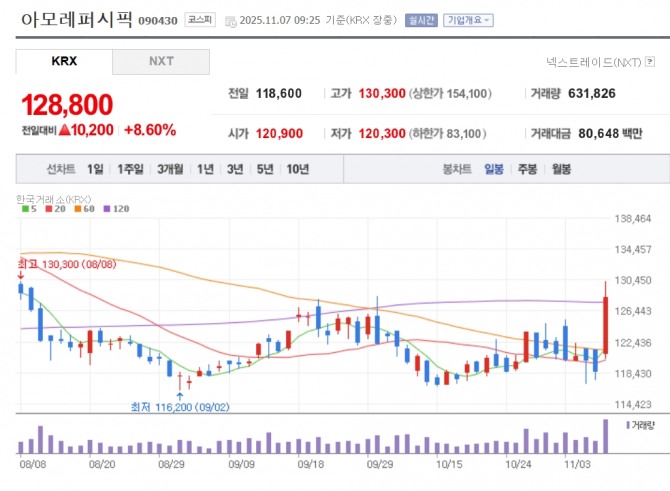 이미지 확대보기7일 한국거래소에 따르면 오전 09시25분 기준 아모레퍼시픽은 전일 대비 8.06% 오른 12만8800원을 기록하고 있다.