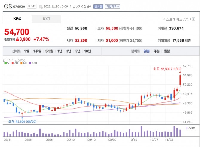 이미지 확대보기10일 한국거래소에 따르면 오전 10시 09분 기준 GS 주가는 전 거래일 대비 7.47% 오른 5만4700원에, S-Oil 주가는 전 거래일 보다 6.72% 상승한 7만9400원에 거래되고 있다.