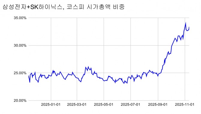 리더스인덱스가 집계한 자료에 따르면 삼성·SK그룹의 합산 시가총액은 올해 초 704조 원에서 1516조 원으로 불어나 전체 시장의 40%에 육박했다. 삼성그룹은 17개 상장사의 시총이 503조 원에서 943조 원으로 87% 증가했으며, SK그룹 역시 21개 상장사의 시총이 200조 원에서 572조 원으로 185% 급증했다.