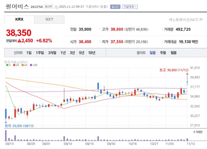 이미지 확대보기12일 한국거래소에 따르면 오전 9시57분 펄어비스는 전 거래일 대비 6.82% 오른 3만8350원에 거래되고 있다.