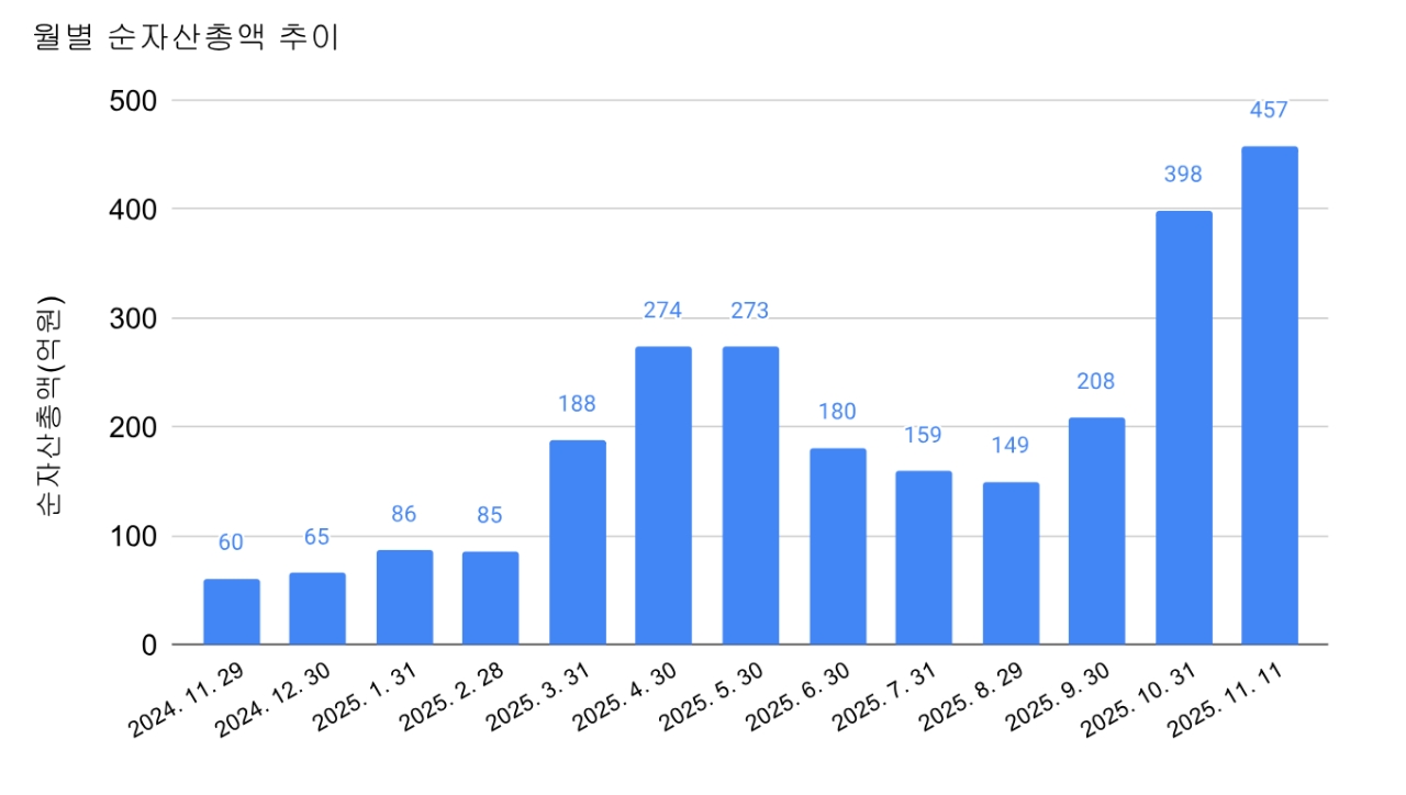 이미지 확대보기이 같은 호조에 힘입어 자금 유입도 확대됐다. 현재 순자산 규모는 457억원으로 1년만에 약 7배 이상 몸집이 커졌다.