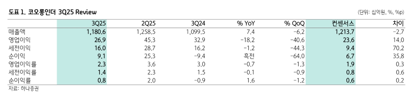 이미지 확대보기3분기 영업이익은 269억원으로 전년 동기 대비 18% 감소했지만, 컨센서스(236억원)를 14% 상회했다.