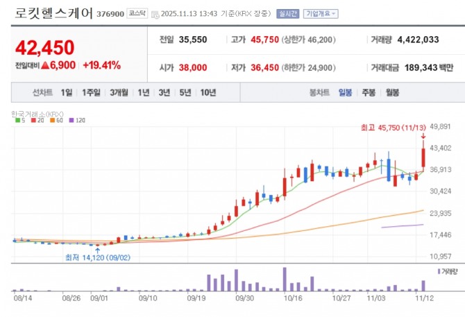 이미지 확대보기13일 한국거래소에 따르면 오전 13시 43분 현재 로킷헬스케어는 전 거래일보다 19.41% 오른 4만 2450원에 거래되고 있다. 장중 4만 5750원까지 치솟아 52주 신고가를 경신했다.