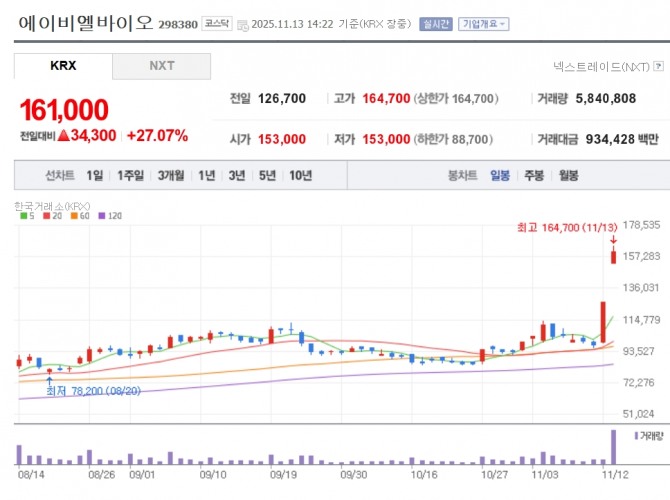 이미지 확대보기13일 한국거래소에 따르면 이날 오후 14시 22분 기준 에이비엘바이오는 전 거래일 대비 27.07% 상승한 16만1000원에 거래되고 있다. 장 초반에는 상한가이자 52주 신고가인 16만4700원을 기록했다.