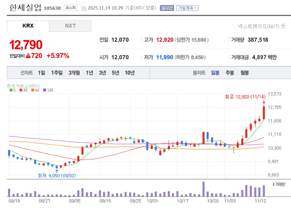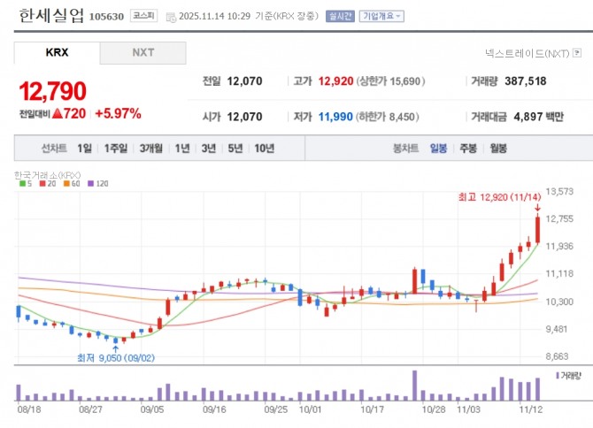 이미지 확대보기14일 한국거래소에 따르면 한세실업은 오전 10시29분 기준 한세실업은 전 거래일 대비 5.97% 오른 1만2790원에 거래되고 있다. 전날까지 한세실업은 3분기 관세 압박에도 준수한 실적을 거두자 7거래일 연속 상승했다.