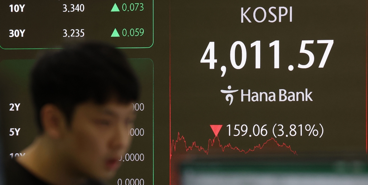 14일 한국거래소에 따르면, 코스피는 전 거래일 보다 3.81%(159.06포인트) 하락한 4011.57로 마감했다.