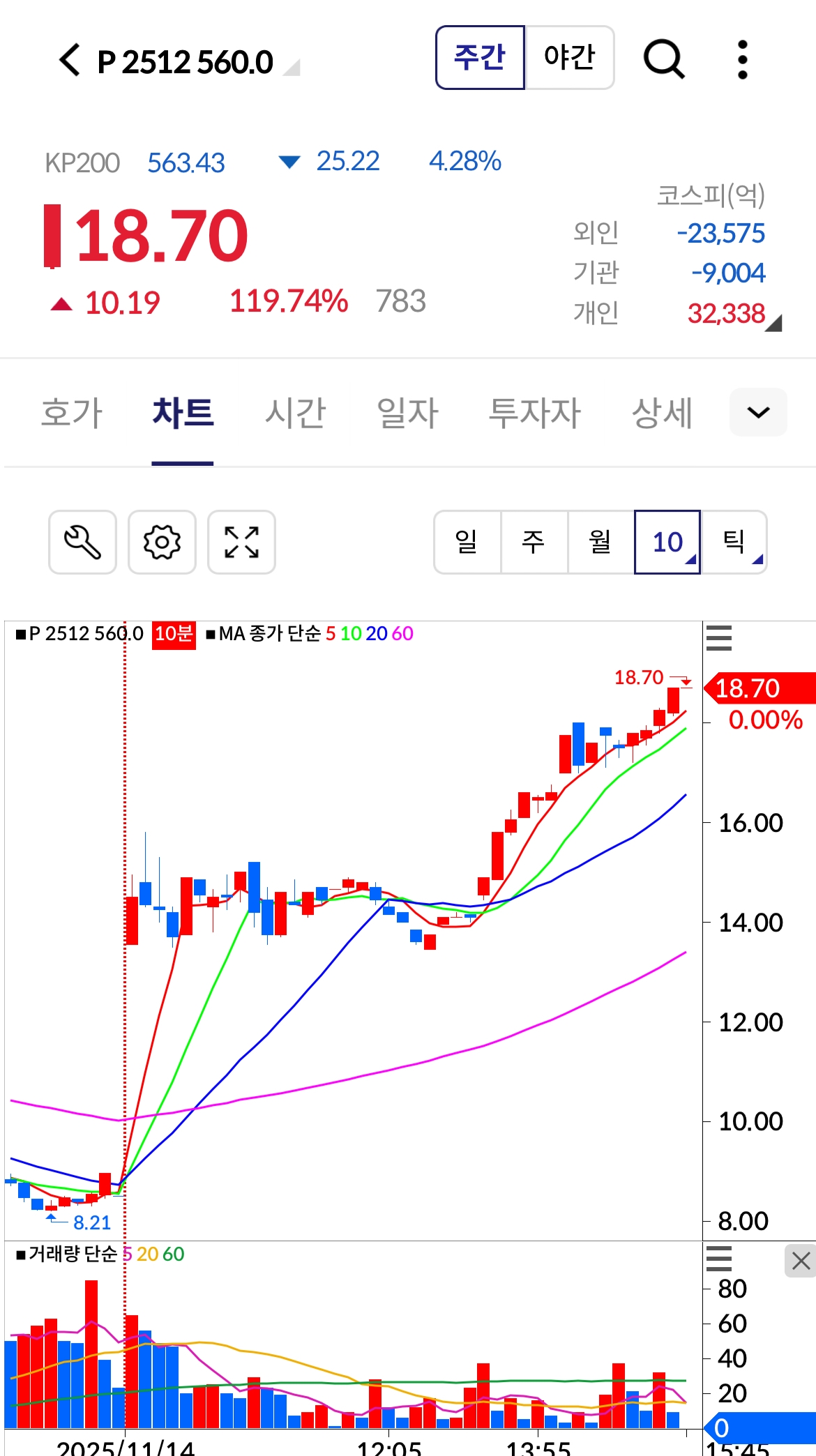반면 동일 행사가격의 코스피200 콜옵션(202512 560.0)은 정반대 흐름을 보였다.