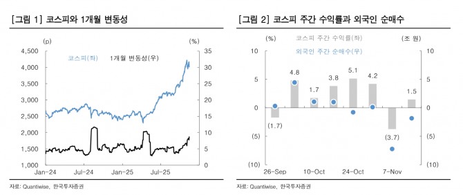 이미지 확대보기김대준 한국투자증권 연구원 “이달 들어 외국인 매도세가 강화되면서 코스피 변동성이 확대됐다”며 “특히 11월 초 사상 최고치(4221.87포인트) 기록 직후 외국인의 매도 규모가 빠르게 늘어났다”고 짚었다. 실제로 외국인은 11월 4일부터 14일까지 대부분의 거래일에서 순매도를 보였다. 4일·5일·14일에는 각각 2조 원 이상을 팔아치웠다.