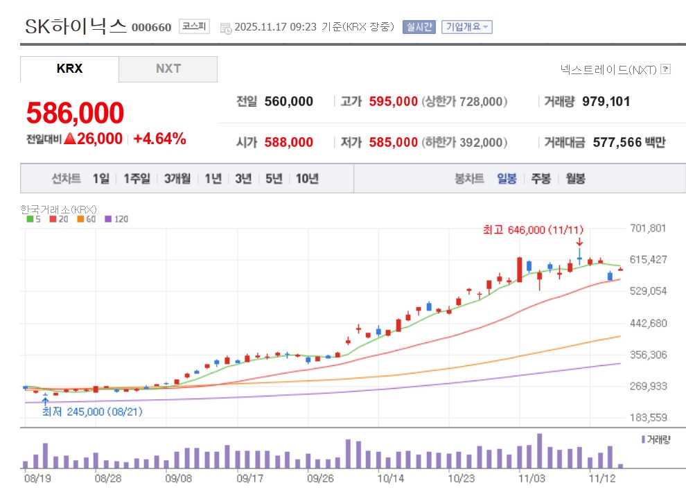 이미지 확대보기17일 한국거래소에 따르면 이날 오전 9시 23분 SK하이닉스는 전일 대비 4.64% 오른 58만6000원을 기록하고 있다. 장 초반 59만 5000원까지 오르며 '60만닉스' 회복을 넘봤다. SK하이닉스는 지난 14일 8.50% 하락한 56만 원으로 장을 마쳤으나 반등하는 모습이다. 5.45% 하락해 9만 7200원에 장을 마감했던 삼성전자도 이날은 10만 1000원까지 오르기도 했다.