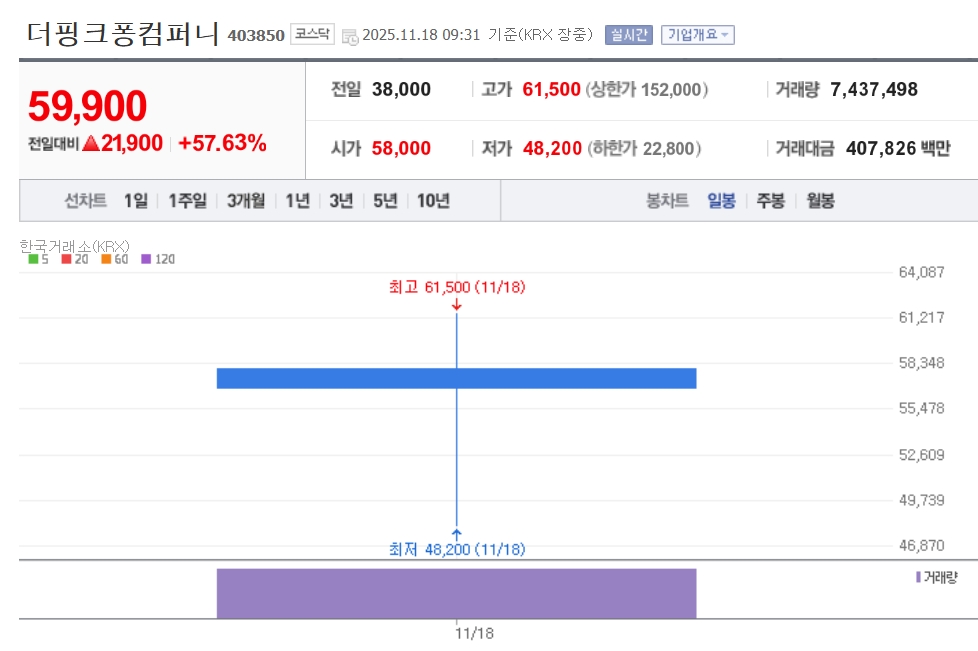 이미지 확대보기18일 한국거래소에 따르면 더핑크퐁컴퍼니는 이날 오전 9시 31분 기준가(공모가) 대비 57.63% 오른 5만9900원에 거래되고 있다. 더핑크퐁컴퍼니는 5만8000원에 거래를 시작해 상장 직후 6만1500원까지 오르기도 했다.