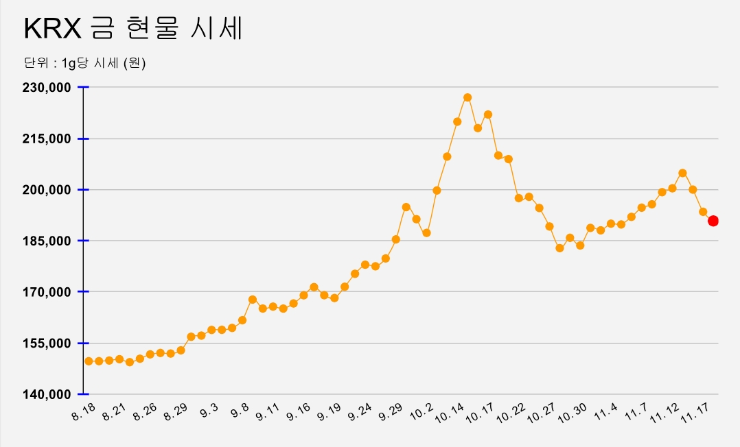 금현물 가격은 11월 13일 20만4830원을 기록한 이후 연일 하락세를 보이면서 조정양상을 나타냈다.
