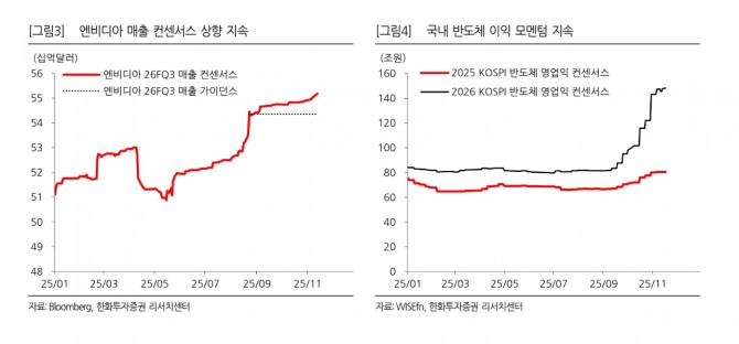 또 “11월 들어 2026년 코스피 영업익 컨센서스가 402조원에서 410조원으로 8조원 상향됐는데 그 중 5조원을 반도체가 올렸다”며 “여전히 반도체가 다른 업종에 비해 이익 모멘텀이 강한데다 유지되고 있고 유동성도 늘어나는 추세다”라고 설명했다.
