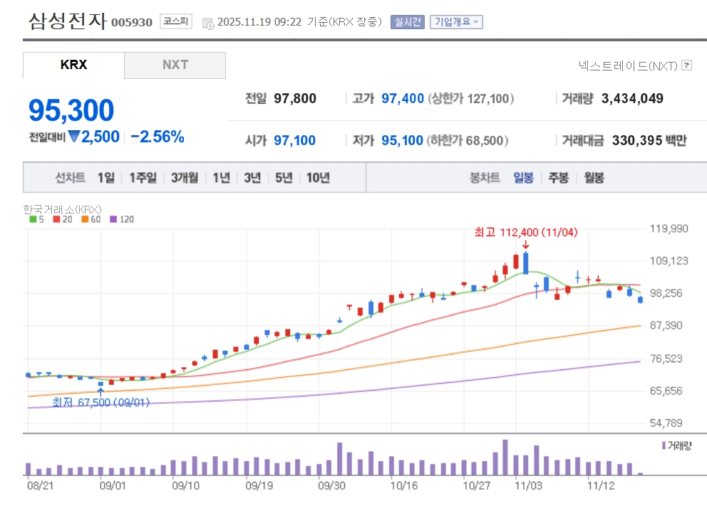 이미지 확대보기19일 한국거래소에 따르면 이날 오전 9시 27분 현재 삼성전자는 전 거래일 대비 2.56% 하락한 9만5300원, SK하이닉스 역시 3.33% 내린 55만1000원을 기록 중이다.