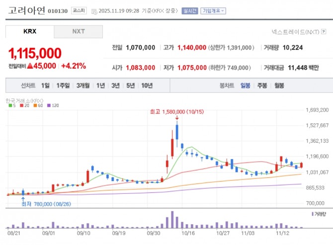 이미지 확대보기19일 한국거래소에 따르면, 고려아연 주가는 6.54%(7만원) 상승한 114만원에 거래를 마감했다.