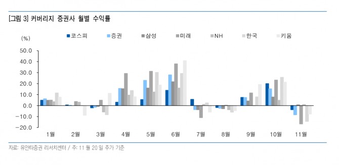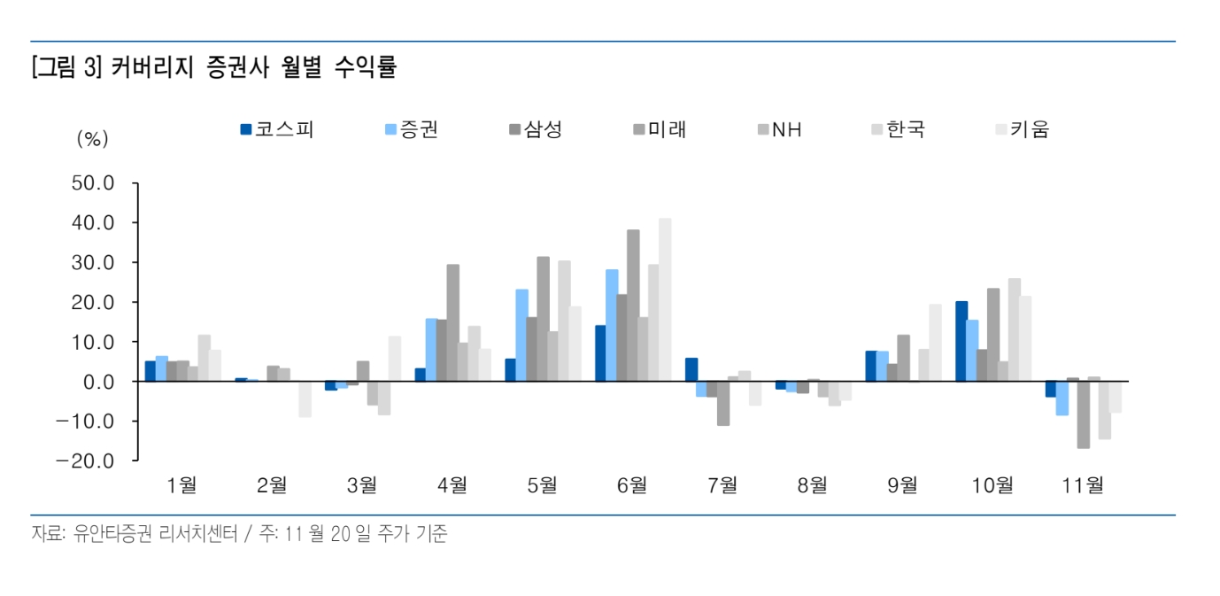 또 “10월 국내 일평균 거래대금은 40조 3000억원으로 3분기 일평균거래대금 25조 8000억원을 크게 상회하고 있으며 11월 역시 양호한 거래대금 수준을 보이고 있다고 판단된다”며 “해외 거래대금 역시 10월 크게 증가하였으며 4분기 브로커리지 수익은 양호할 전망으로 순영업 수익 중 브로커리지 비중이 비교적 높은 삼성증권의 수혜가 예상된다”고 마무리 했다.