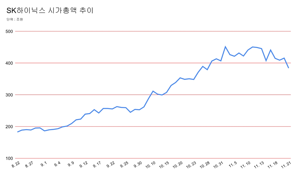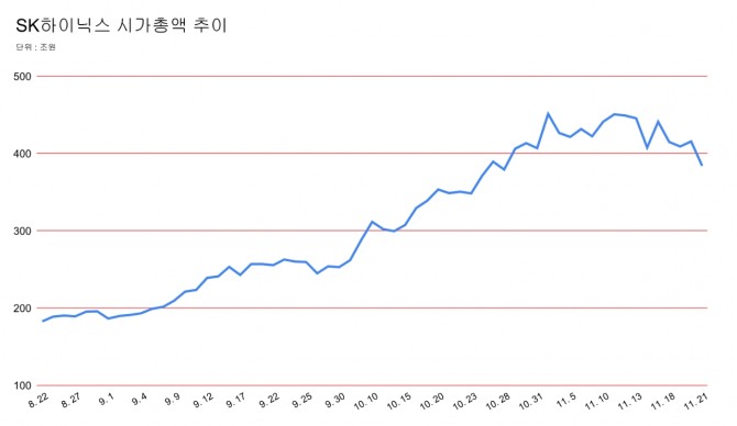 SK하이닉스 시가총액이 400조원 아래로 내려온 것은 지난달 28일 이후 처음이다.