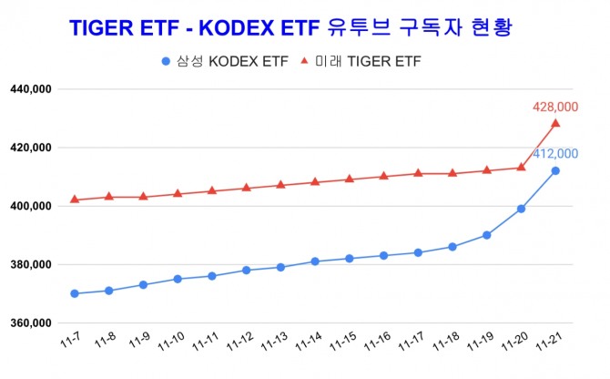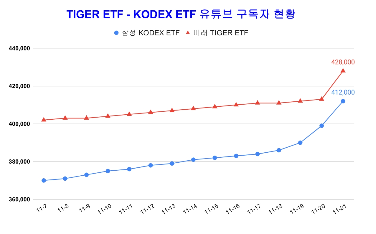 같은 기간 TIGER ETF 채널도 40만2000명에서 42만8000명으로 2만6000명 증가했지만, 단기 증가 속도는 KODEX가 두 배 가까이 빠른 셈이다.