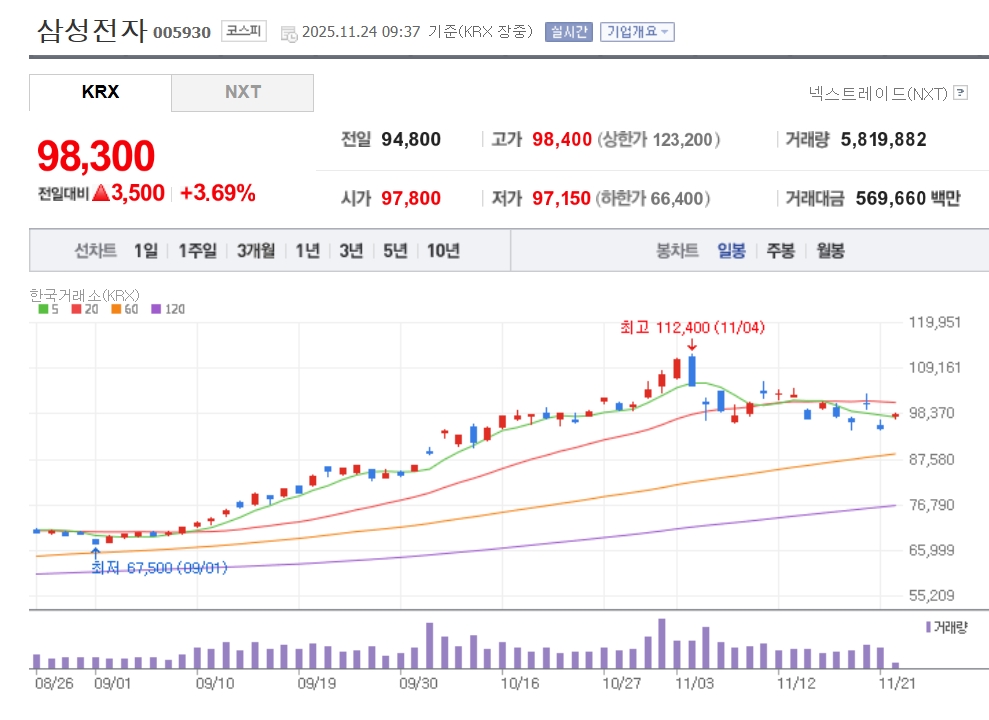 이미지 확대보기24일 한국거래소에 따르면 삼성전자는 오전 9시 37분 전장보다 3.69% 오른 9만8300원에, SK하이닉스는 2.11% 오른 53만2000원에 거래되고 있다.